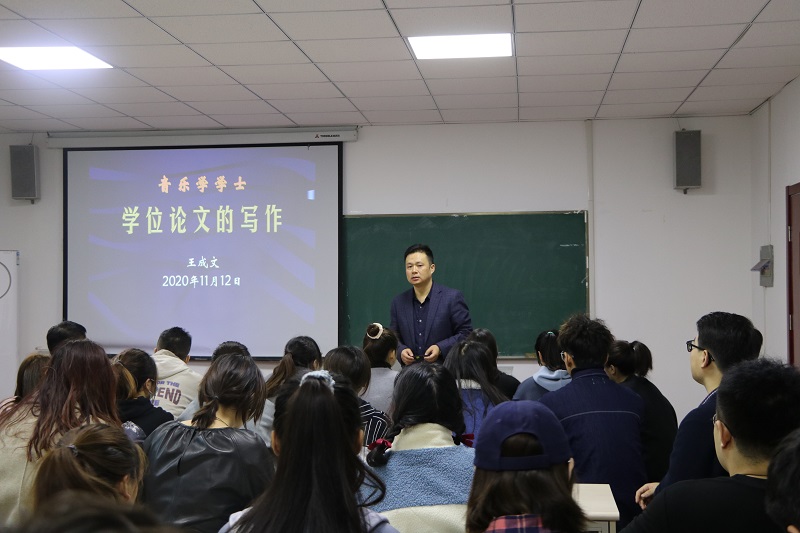 讲座伊始,王成文教授强调了毕业设计在人才培养中的重要作用,动员并鼓励学生用严谨求实的态度认真对待毕业设计(论文)写作,及时总结归纳研究成果;从写好论文的三要素与论文的共性展开,为学生详细介绍了本科学位论文的结构和格式以及写作的意义与价值;同时,强调论文优秀与否的关键在于是否有创新点,鼓励学生在撰写论文中加入自己特色鲜明的思想,不能因循守旧。最后,王成文教授在总结中提到,作为一名合格的音乐学专业学生,不仅要热爱舞台,钻研专业,更要丰富自己的思想,提升自己的学识;撰写毕业论文是在校大学生学习成果的综合性总结和检阅,要重视毕业论文的写作,提高综合能力水平,为大学学业画上圆满的句号。