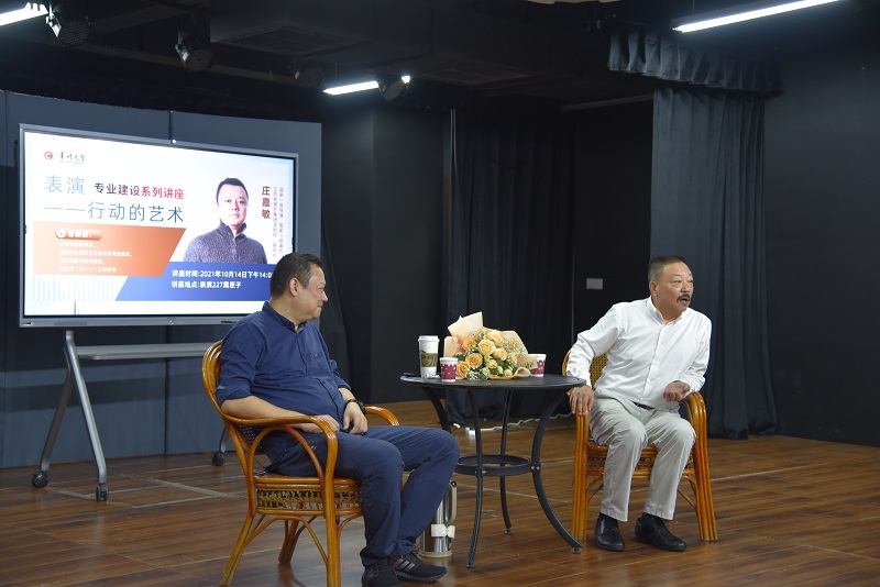 讲座伊始,庄嘉敏导演以一线戏剧工作者的经验告诉同学们舞台表演中行动的重要性,以及演员内部节奏和外部节奏如何统一。蔡伟老师分享了自己多年舞台实践中的真实感受和技术技巧,为同学们阐述什么是表演艺术。活动以互问互答的形式进行,从多角度为学生们提供了表演的技术性指导,给初入校园的21级新生们揭开了表演的神秘面纱。