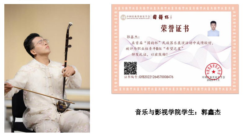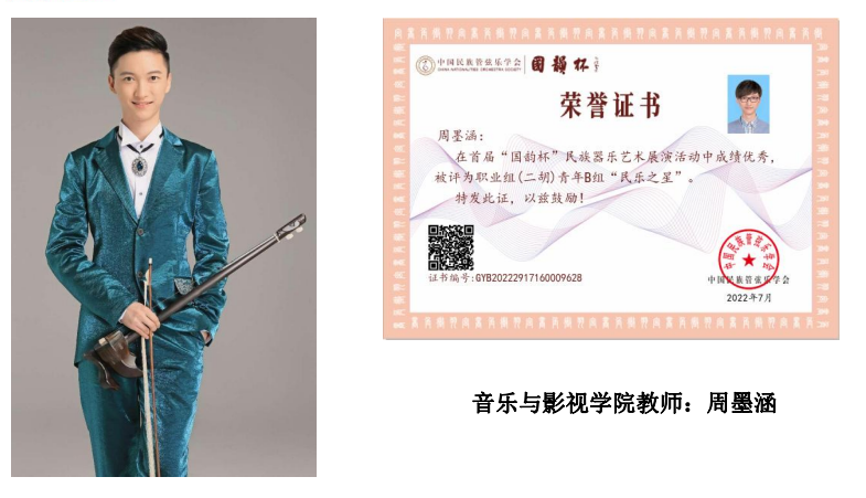 国产探花 国产探花 音乐系师生积极备赛,紧锣密鼓地进行参赛作品录制。经过激烈角逐,最终我校师生喜获六项国家级奖项。其中,周墨涵、江逸两位老师获得职业组青年B组“民乐之星”,并入选“中国民族管弦乐学会优秀民乐人才扶持计划”;赵欣彤、朱淑琦两位老师获得职业组青年B组“未来之星”;18级学生郭鑫杰、21级学生黄梓涵获得职业组青年B组“希望之星”