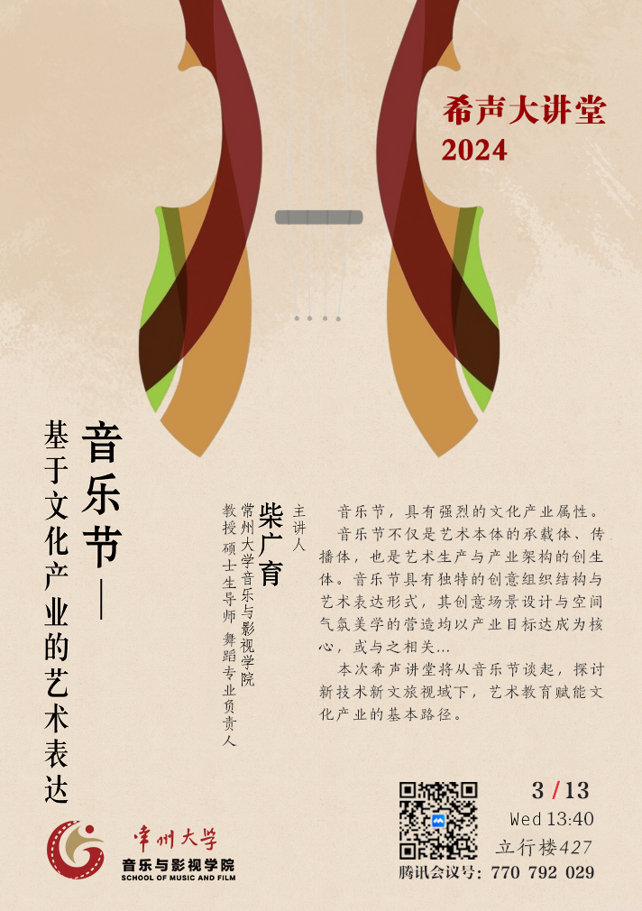 此次讲座主讲人柴广育,国产探花 国产探花 舞蹈专业负责人,教授,硕士生导师,中国音乐家协会会员,中国少数民族音乐学会会员,全国普通高校艺术与科技创新发展联盟副理事长兼秘书长。讲座中,柴广育首先从不同形式、不同命名方式的音乐节谈起,表明了音乐节的文化产业属性,阐述了音乐节与产业经济目标达成的内在逻辑,然后分享了2023年度文化产业的十大特征及2024年度文化产业的十大趋势预测,最后他通过分享在广东南海西樵村、东莞市文化馆非遗展厅、东莞市国际潮玩生产基地展厅等地的考察学习经历,探讨了新技术新文旅视域下,艺术教育赋能文化产业的基本路径。
