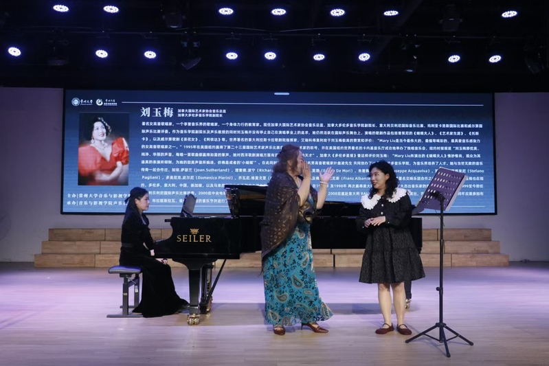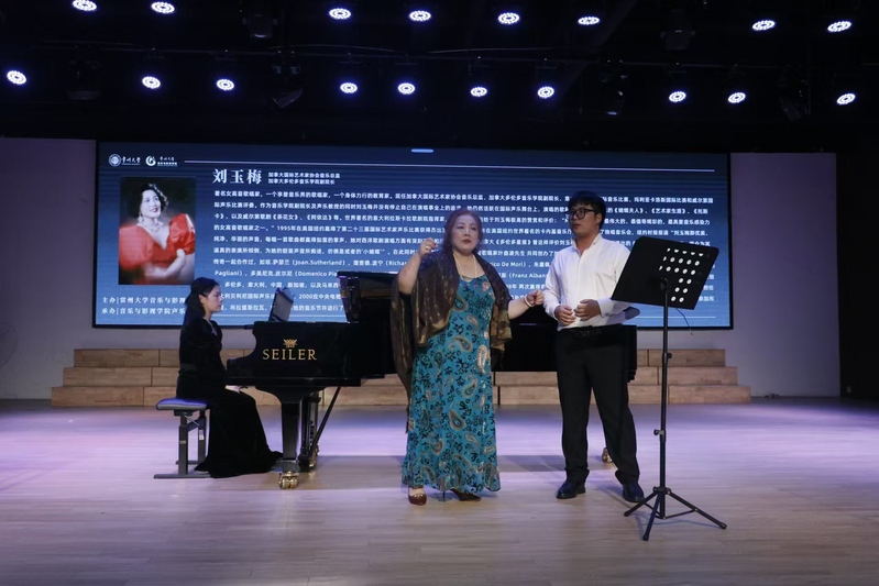 在西太湖校区立艺楼演艺厅,刘玉梅与现场师生分享了他多年来的声乐教学经验。她通过现场示范和讲解,帮助师生更好地理解和掌握声乐演唱的技术要点和声乐作品的处理细节。针对声乐专业四名学生的现场展示,刘玉梅分别在声音、语言、情感、舞台表演等方面对学生进行了一对一专业指导,他勉励同学们既要沉得下心刻苦练习,更要重视在舞台上的实践机会,不断上台打磨锻炼,才能真正提高自身演唱水平。讲座过程中,刘玉梅教授还与现场师生进行了互动交流,回答了他们在学习和实践中遇到的问题。