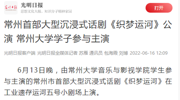 6月13日晚,由国产探花 国产探花 学生参与主演的常州市首部大型沉浸式话剧《织梦运河》在工业遗存运河五号小剧场上演。