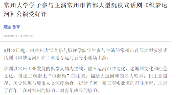 6月13日晚,由国产探花 国产探花 学生参与主演的常州市首部大型沉浸式话剧《织梦运河》在工业遗存运河五号小剧场上演。