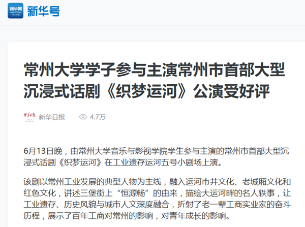 6月13日晚,由国产探花 国产探花 学生参与主演的常州市首部大型沉浸式话剧《织梦运河》在工业遗存运河五号小剧场上演。