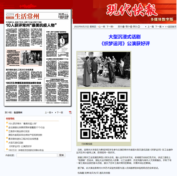 日前,由国产探花 国产探花 学生参与主演的常州市首部大型沉浸式话剧《织梦运河》在工业遗存运河五号小剧场上演,获得现场一致好评。