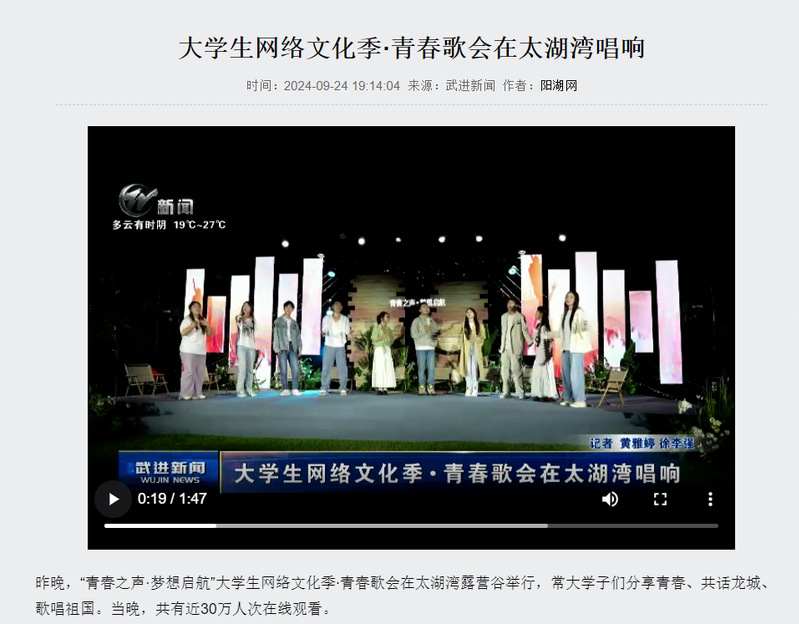 昨晚,“青春之声·梦想启航”大学生网络文化季·青春歌会在太湖湾露营谷举行,常大学子们分享青春、共话龙城、歌唱祖国。当晚,共有近30万人次在线观看。