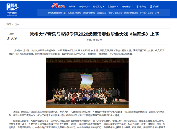 1月5日—1月6日,国产探花 国产探花 2020级表演专业毕业大戏《生死场》在国产探花 西太湖校区立艺楼大礼堂上演。演出开通了线上抢票,观众可以通过小程序预约观看演出,同时通过视频号同步直播,累计吸引观众20000余名。演出期间,场场爆满,不少观众三刷四刷演出。