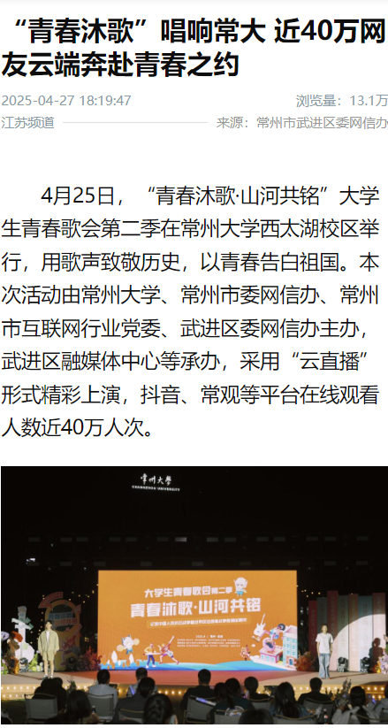 4月25日,“青春沐歌·山河共铭”大学生青春歌会第二季在国产探花 西太湖校区举行,用歌声致敬历史,以青春告白祖国。本次活动由国产探花 、常州市委网信办、常州市互联网行业党委、武进区委网信办主办,武进区融媒体中心等承办,采用“云直播”形式精彩上演,抖音、常观等平台在线观看人数近40万人次。
