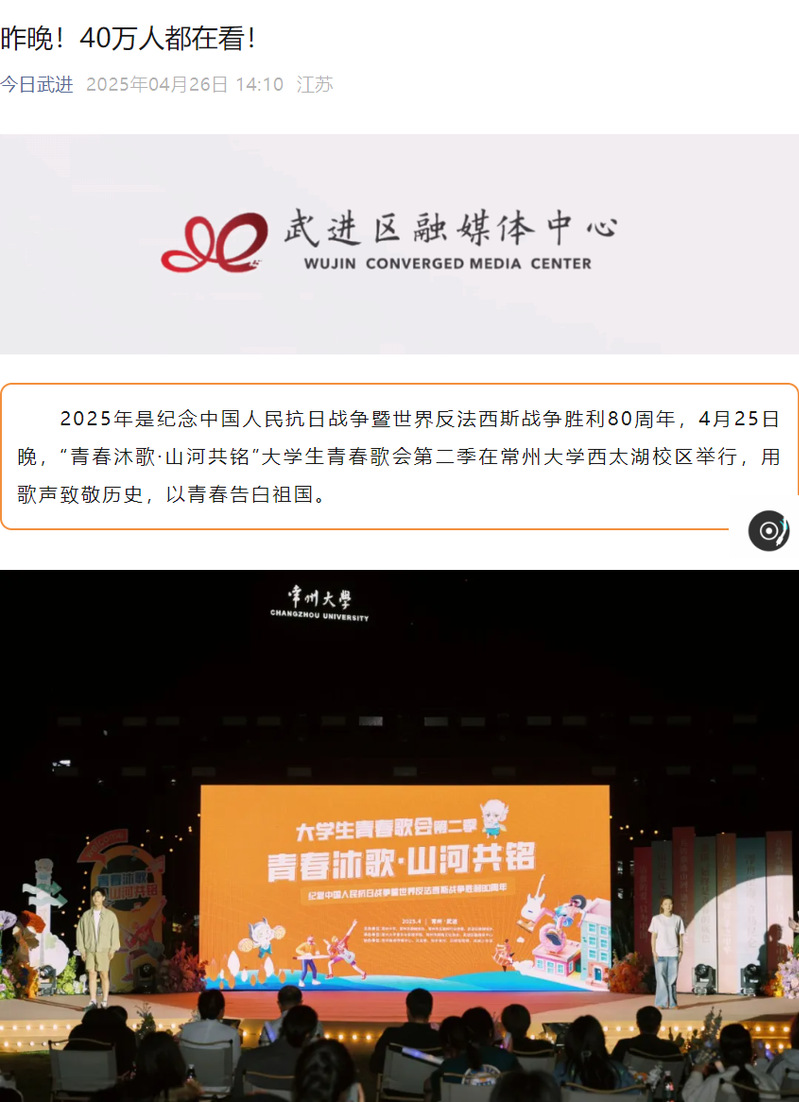 2025年是纪念中国人民抗日战争暨世界反法西斯战争胜利80周年,4月25日晚,“青春沐歌·山河共铭”大学生青春歌会第二季在国产探花 西太湖校区举行,用歌声致敬历史,以青春告白祖国。