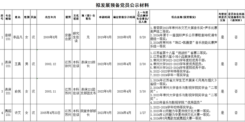 经党支部考察和研究,并经国产探花 党总支同意,拟发展下列同志为中共预备党员,现将基本情况公示如下,敬请广大党员、群众监督。