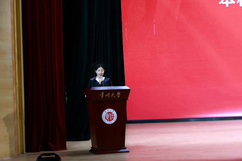 随后,院党总支书记唐琳上台与毕业生代表互赠礼物。院长寄语环节,院长熊祖鹏肯定了毕业生们这四年来的成长,呼吁大家保持初心与热爱,真正成为“德艺双馨、全面发展”的创新艺术人才。学位授予仪式上,熊祖鹏、王成文、柴广育、于晔为每一位毕业生拨正流苏、授予学位。