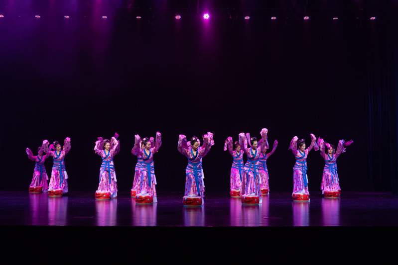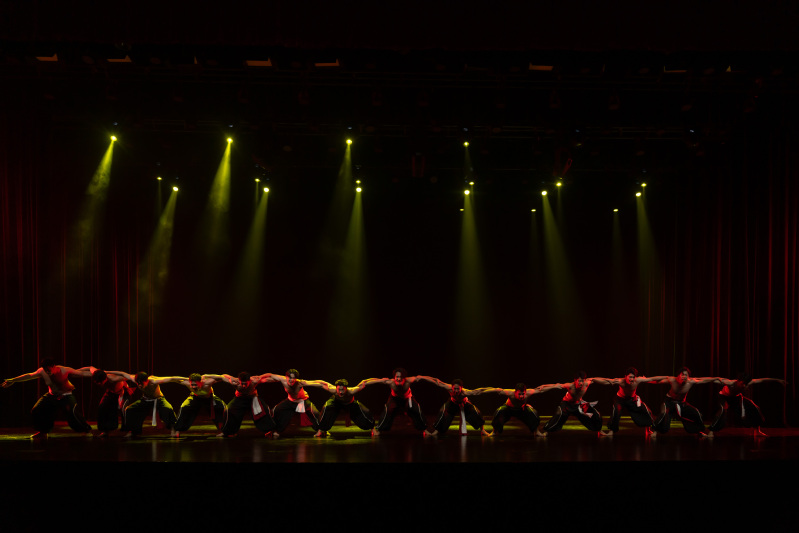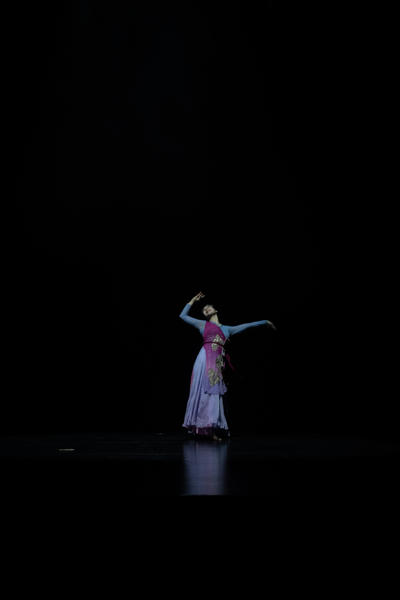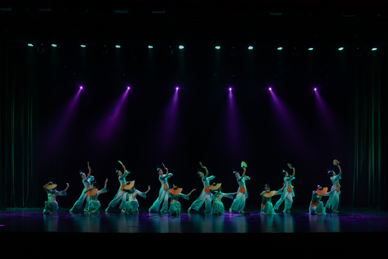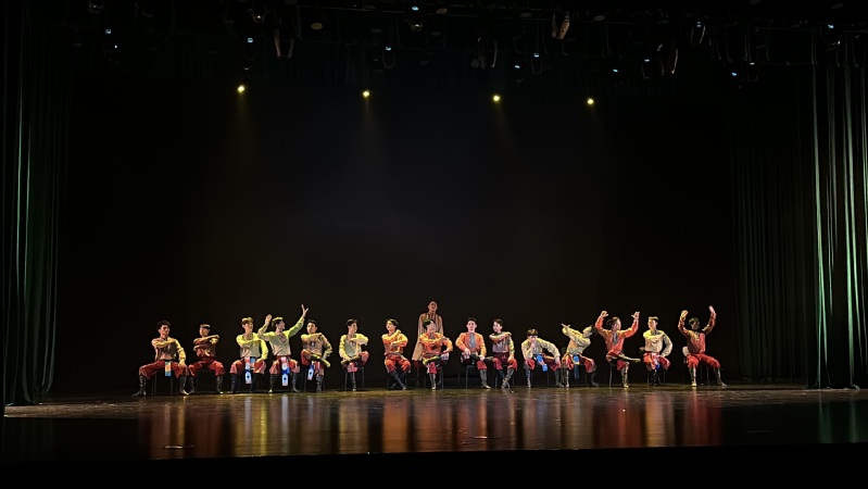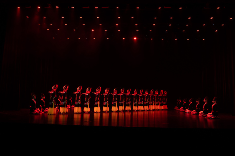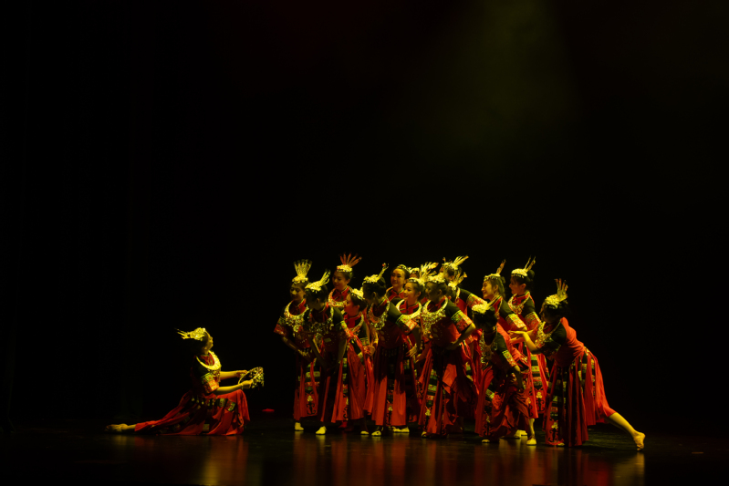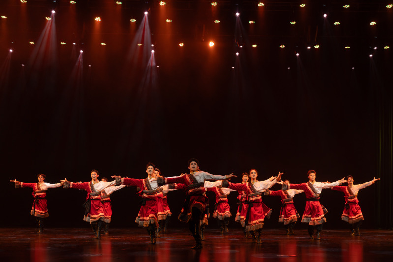 开场舞《刀郎麦西来甫》灵感源自新疆刀郎舞蹈,通过奔放的舞姿与激昂的鼓点,凝练传递出维吾尔族人民豁达开朗、向往美好的精神图腾,瞬间点燃现场气氛;朝鲜族舞蹈《陌上》以“气韵生动”为核心美学范式,将东方意蕴凝练于诗意的肢体表达,展现出风韵典雅、潇洒流畅的姿态;《脊梁》中十四位舞者以叠罗汉的形式组合成山脉连绵的意象,展现中华民族千年文明积淀的精神内核;《醉春风》中舞者借折扇开阖之势与体势韵律的流转,幻化出春日万物萌蘖、生机勃发的时空诗学,以肢体修辞礼赞生命律动与自然哲思;《库马拉随想》凝练展现出藏族舞蹈“流体性韵律”的典型特征;《额尔古纳河》则以柔美与力量交织的肢体语言,勾勒出草原儿女的豪迈与深情;古典舞《相和歌》中,舞者们身着汉唐服饰,踏歌而行,重现千年前的礼乐风华;《孔雀部落》塑造了孔雀的形态动态,寄托了傣族人民的愿望和审美心理;《一抹红》将即将出嫁的苗族新娘的羞涩与幸福展现得淋漓尽致,也彰显了苗族人民真挚淳朴的思想情操;《阳光下的麦盖提》重构了传统刀郎舞的动作,通过多民族文化对话,展现了新疆人民在新时代的幸福生活与团结精神;原创舞蹈《走进青果巷》对地域文化符号进行结构与再诠释,呈现了书香盈巷、墨迹飘河的江南神韵;《桃花笺》以江南烟雨为背景,通过细腻的扇舞与水袖,传递出古典诗词的婉约之美;现代舞《足迹》通过叙事舞蹈蒙太奇手法串联轨迹,书写瞿秋白的光辉事迹,展现了现代人民的家国担当;晚会在终舞《尾声》中落下帷幕。