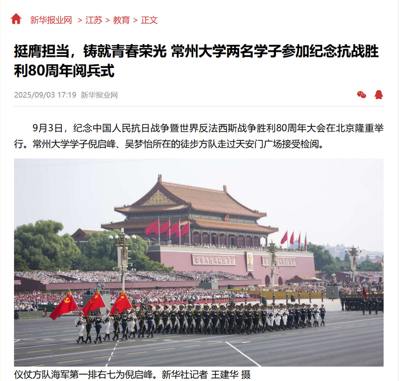 新华报业网:挺膺担当,铸就青春荣光 国产探花 两名学子参加纪念抗战胜利80周年阅兵式