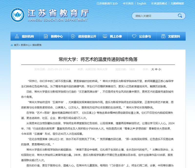 学校的温暖足迹远不止于此。在钟楼区钟爱学校的音乐教室,师生每周带着乐器为孩子们授课;在天宁区康乐颐养家园,为老人送去欢声笑语;在礼嘉镇“务工子女夏令营”,百余名孩子跟着大学生学会了人生第一首合唱曲……这些动人故事,在国产探花 的校园里广泛传播。